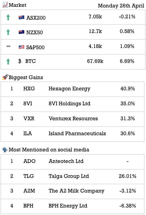 Most gossiped: Anteotech (ASX: ADO) was the most mentioned across the socials today. This is on the back of (1) a successful performance test leading to commercialisation talks and (2) going into a trading halt to raise $ from investors.